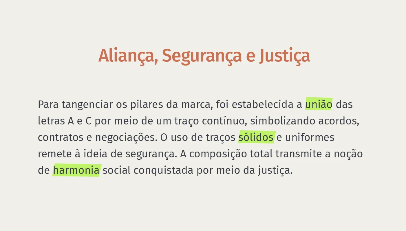 Desenvolvemos a identidade visual da advogada especializada em Direito Imobiliário, sustentada pelos pilares de aliança, segurança e justiça. Para traduzir esses valores construímos um símbolo a partir das iniciais A e C, unidas por um traço contínuo que remete a acordos e negociações. A combinação de linhas precisas e espaços em branco reforça solidez e serenidade, resultando em uma marca equilibrada que expressa confiança e harmonia jurídica.