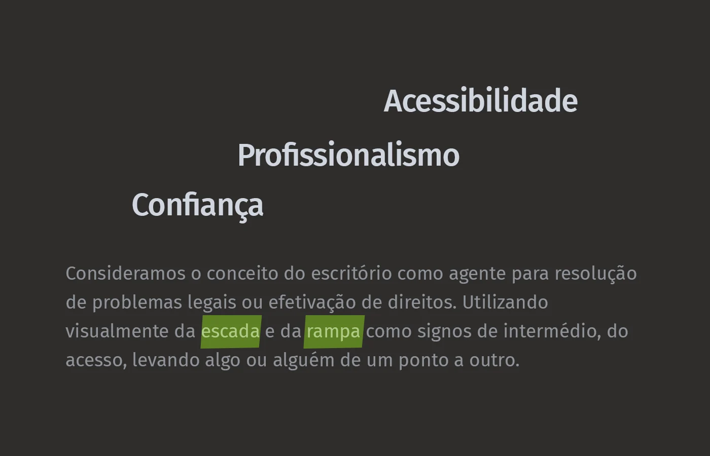 Foi desenvolvido um sistema de identidade visual para o escritório Lopes e Silva Advogados, oferecendo bases sólidas para seu posicionamento. A marca nasce sustentada pelos pilares da Confiança, do Profissionalismo e da Acessibilidade. A partir disso, definimos o conceito do escritório como um agente que conduz à resolução de problemas legais. Visualmente, a escada e a rampa simbolizam esse papel de intermédio, representando a passagem segura de um ponto a outro.